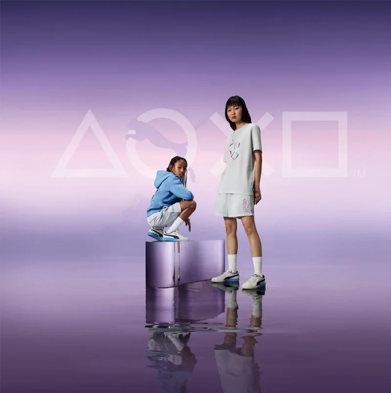 A coleção PUMA x PLAYSTATION apresenta versões atualizadas dos clássicos sneakers Suede e RS-X da PUMA, cada um em duas cores diferentes, com o logo icônico da PlayStation na etiqueta da língua e pingente no cadarço. Completam a collab roupas estampadas inspiradas em PlayStation, com detalhes holográficos e técnicas de brilho.